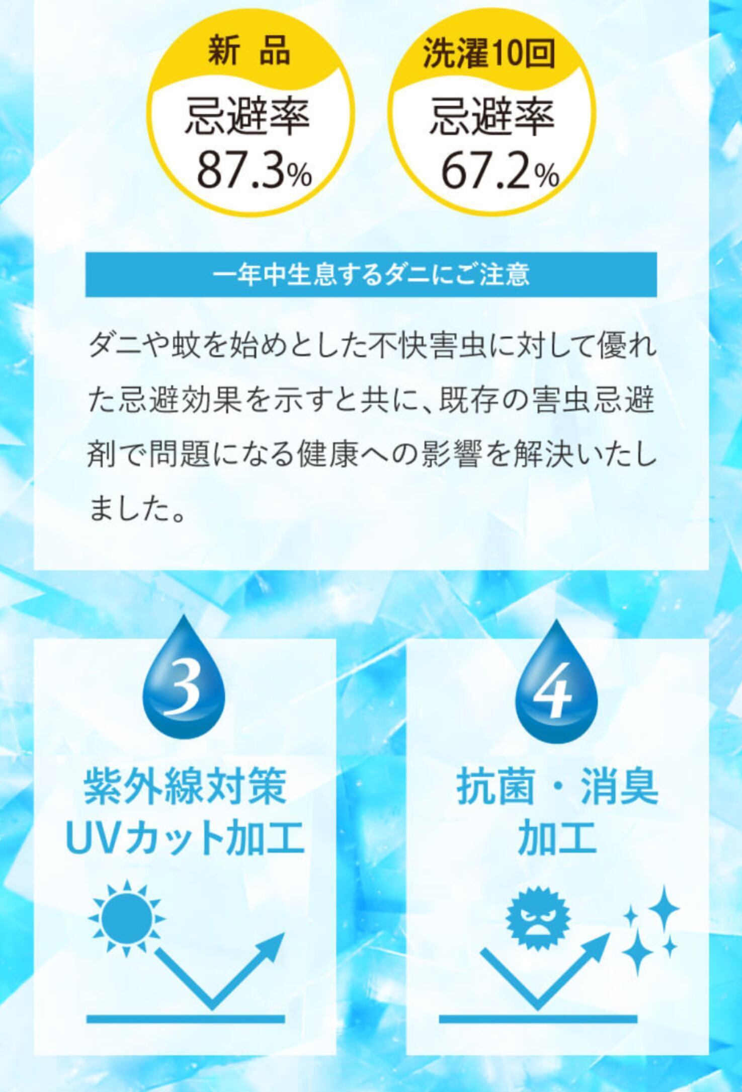涼感素材で涼しいだけでなく、UVカット加工・防虫加工・抗菌&消臭加工の『4つの機能』が、この1枚に凝縮されてます!