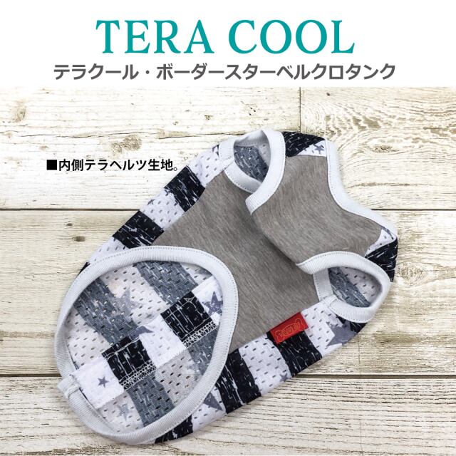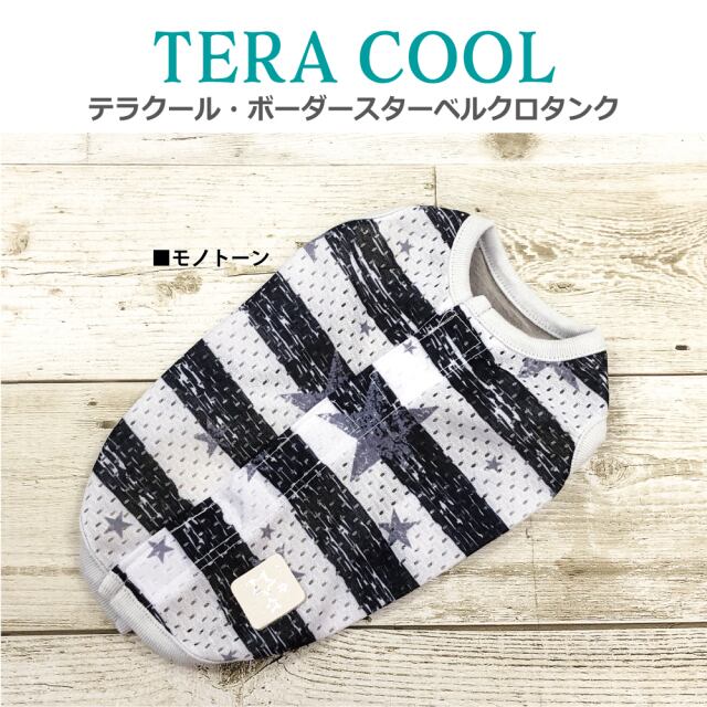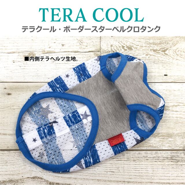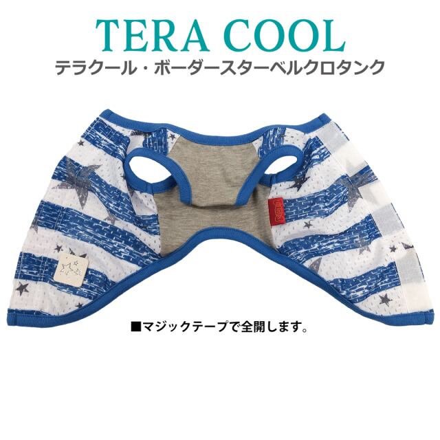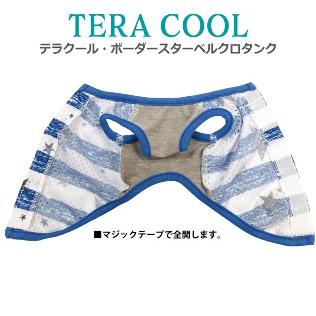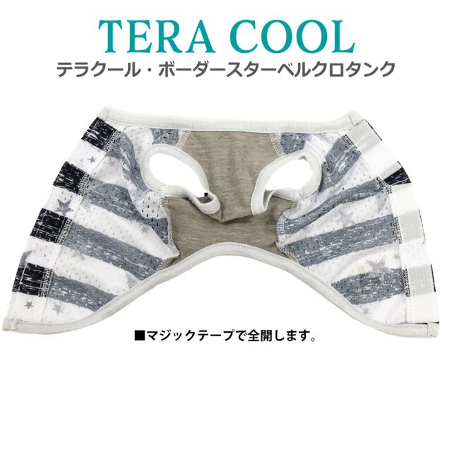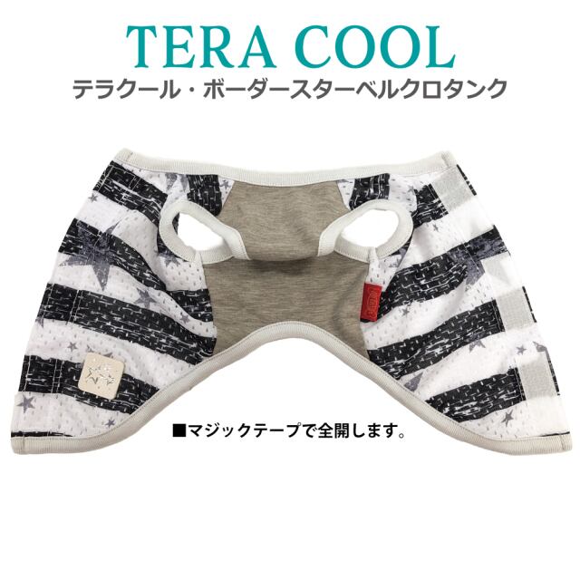 2025年クークチュールナ夏物新作登場! 背中はスーパークール×クール生地、前身頃はテラヘルツ生地使用。 「クール加工」「防虫加工」「UVカット加工」「抗菌・消臭加工」4つの「スーパークール×クール」機能+「テラヘルツワン」の機能まで網羅したコスパ抜群の「テラクール」。 スーパークール×クール生地のみ使用のウェアよりも伸びが良いのも高ポイント♪ シンプルボーダー+星の背中開きタンク。マジックテープで全開するので着脱ラクチン。 同じ柄のスーパークール×クールタンク、ハーネス、ベルクロテラバンドBOYがあります。 サイズはSS/S/M/L/LL/3L/ST/MT/LTサイズあります。