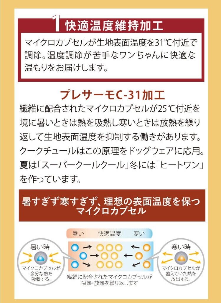 マイクロカプセルが生地表面温度を31℃付近で調節。温度調節が苦手なワンちゃんに快適な温もりをお届けします。