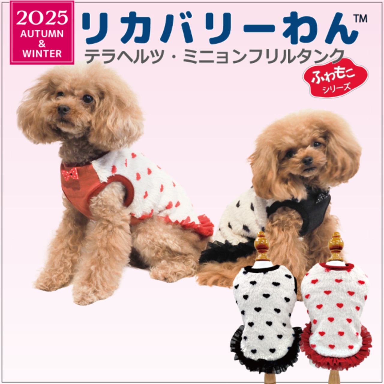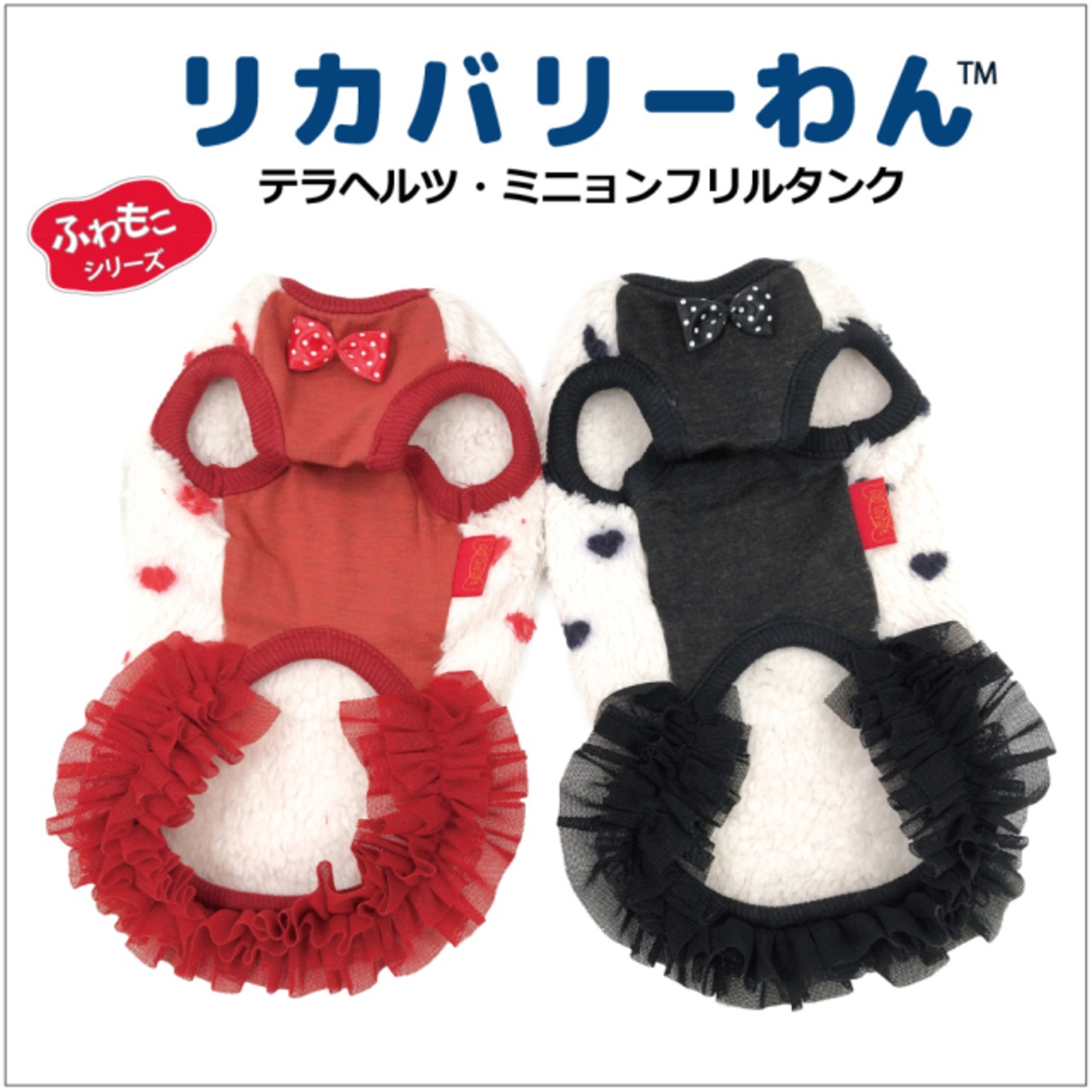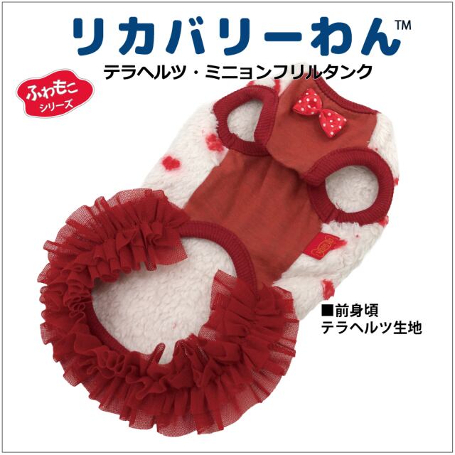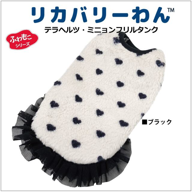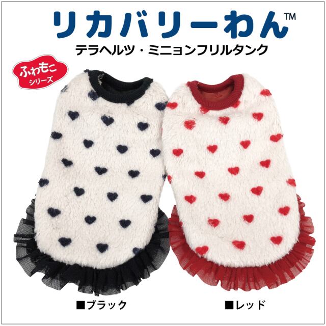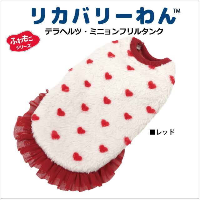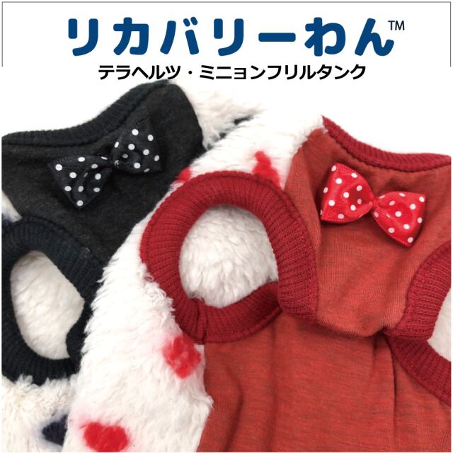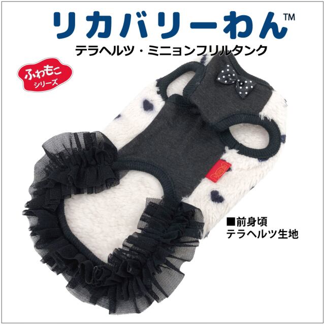究極のパワーストーンといわれるテラヘルツ人工鉱石を配合した生地を使用しています。 ワンちゃんの体の事を考えて作った機能素材「リカバリーわん」シリーズ。 テラヘルツは身体の弱い部分に働きかける作用があります。 浸透能力に優れており、健康を促す働きをすると言われています。 リカバリーウェアとしてすべてのワンちゃんにおすすめですが特にシニアや病気がちのワンちゃんに 効果を発揮するということで介護補助ウェアとしてもご使用いただけます。 プチハート柄が可愛いフリルタンク。表はふわふわのボア。 裏側はテラヘルツ生地。同じ柄のハーネス、マットもあります。