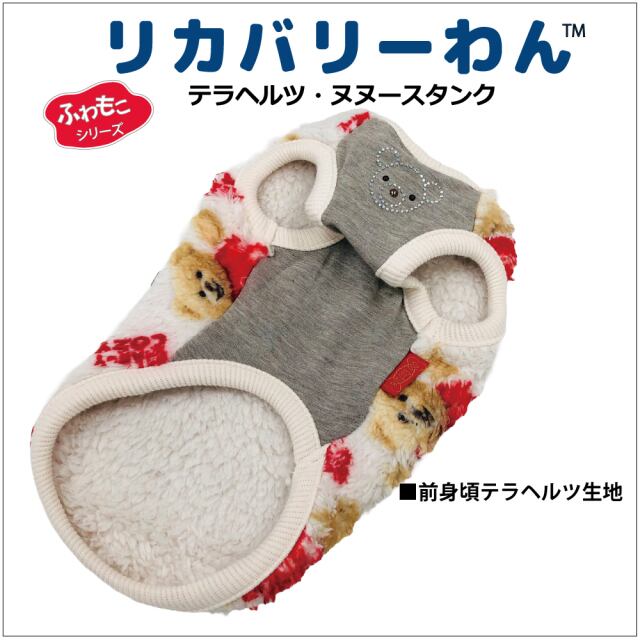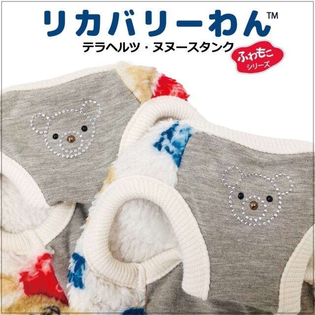 究極のパワーストーンといわれるテラヘルツ人工鉱石を配合した生地を使用しています。 ワンちゃんの体の事を考えて作った機能素材「リカバリーわん」シリーズ。 テラヘルツは身体の弱い部分に働きかける作用があります。 浸透能力に優れており、健康を促す働きをすると言われています。 リカバリーウェアとしてすべてのワンちゃんにおすすめですが特にシニアや病気がちのワンちゃんに 効果を発揮するということで介護補助ウェアとしてもご使用いただけます。 大きめクマさんの総柄タンク。前身頃のキラキラクマさんもCUTE。 表はふわふわのボア。裏側はテラヘルツ生地。同じ柄のハーネス、マットあります。