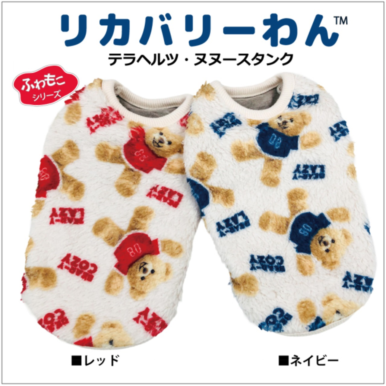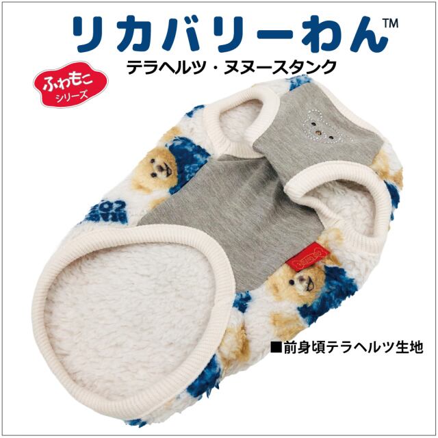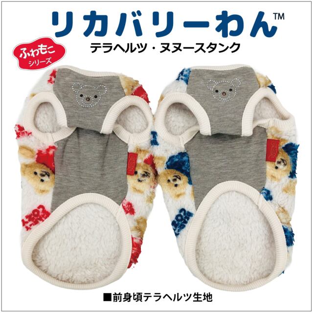 2025年クークチュール秋冬新作登場♪ 究極のパワーストーンといわれるテラヘルツ人工鉱石を配合した生地を使用しています。 ワンちゃんの体の事を考えて作った機能素材「リカバリーわん」シリーズ。 テラヘルツは身体の弱い部分に働きかける作用があります。 浸透能力に優れており、健康を促す働きをすると言われています。 リカバリーウェアとしてすべてのワンちゃんにおすすめですが特にシニアや病気がちのワンちゃんに 効果を発揮するということで介護補助ウェアとしてもご使用いただけます。 大きめクマさんの総柄タンク。前身頃のキラキラクマさんもCUTE。 表はふわふわのボア。裏側はテラヘルツ生地。同じ柄のハーネス、マットあります。