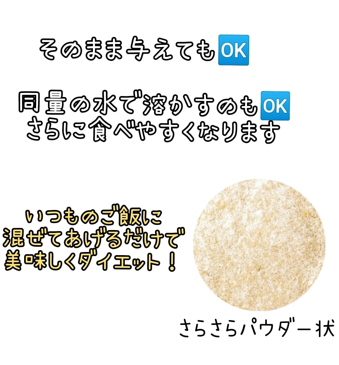 食物繊維たっぷり、お通じもよくなり、フードのかさましに最適です。
