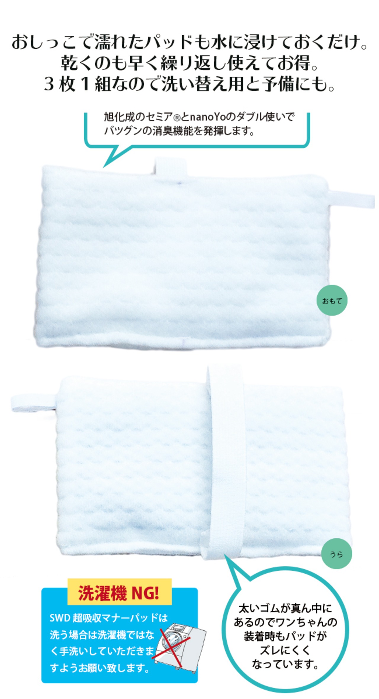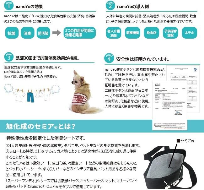 超消臭シリーズ「スーパーワンデオ」を発売いたします。新しい光触媒nanoYoをウェアに使用し、バッグやマット、マナーバンドには更に旭化成のセミアR(特殊活性炭を固定化した消臭シート)のダブル使いで消臭機能を高めました。