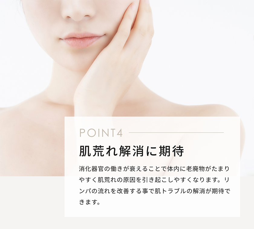 消化器官の働きが衰えることで体内に老廃物がたまりやすく肌荒れの原因を引き起こしやすくなります。リンパの流れを改善する事で肌トラブルの解消が期待できます。