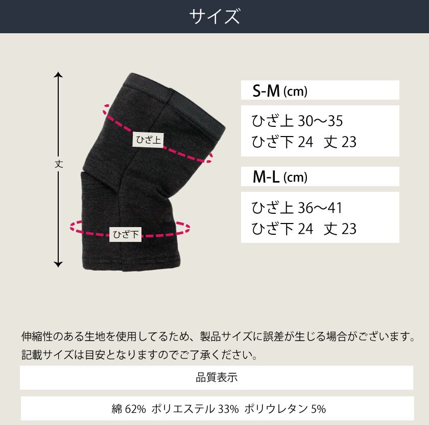 テラヘルツ鉱石を配合して仕立てた生地を使用しています。 「ひざサポーター」は伸縮性の良いずり落ち防止のゴムを使用。ゴムの方から着用して膝頭で位置を調整してください。膝頭には負担のかかりにくい切り替え2重構造を採用してソフトでしなやかな着け心地でケア&サポートができます!リカバリーグッズとしてもオススメいたします。 ストレッチ性があることはもちろん、膝の曲げ伸ばしがしやすいかどうかも重要です。 いつも膝が痛いわけではなく、冷えた時に痛みが出やすいという方には、特におすすめです。2サイズあり装着しても厚みが出ずにスムーズに動かせるのでデイリーの外出時にもご利用いただけます!